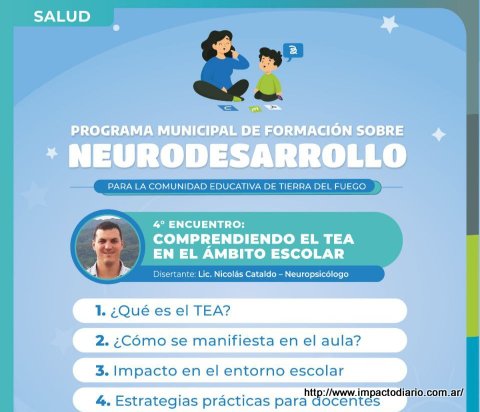 Finaliza el programa municipal de formación sobre neurodesarrollo para la comunidad educativa El Municipio de Río Grande, a través del Centro Municipal de las Infancias -dependiente de la Secretaría de Salud-, llevará adelante el 4° encuentro del Programa Municipal de Formación sobre Neurodesarrollo para la Comunidad Educativa de Tierra del Fuego, una propuesta que culmina