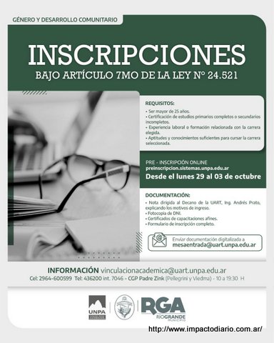 Dicha instancia está destinada a personas que no hayan completado sus estudios del nivel secundario, bajo el Artículo 7 de la Ley Nº 24.521/95. Estas inscripciones se extenderán desde el lunes 29 de septiembre hasta el 3 de octubre inclusive. Aquellos que deseen formar parte deberán ingresar al siguiente link preinscripcion.sistemas.unpa.edu.ar.