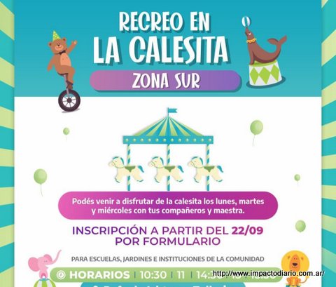 Se trata de una iniciativa pensada para que los y las estudiantes de las escuelas de nivel primario e inicial de nuestra ciudad disfruten este espacio recreativo, los lunes, martes y miércoles con sus compañeros de grado y la maestra. Las inscripciones ya están abiertas y son a través del siguiente link: https://bit.ly/4iIgvMV. La Calesita