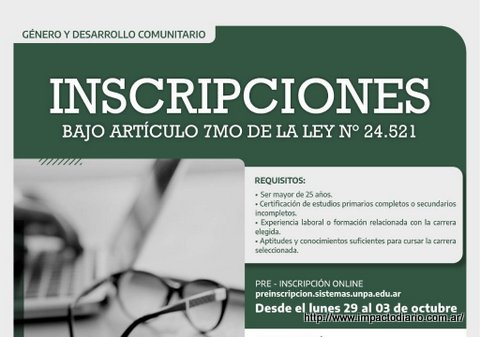 Dicha instancia está destinada a personas que no hayan completado sus estudios del nivel secundario, bajo el Artículo 7 de la Ley Nº 24.521/95. Estas inscripciones se extenderán desde el lunes 29 de septiembre hasta el 3 de octubre inclusive. Aquellos que deseen formar parte deberán ingresar al siguiente link preinscripcion.sistemas.unpa.edu.ar. En el marco del
