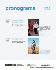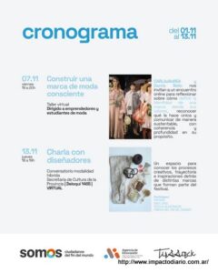 • Viernes 07/11 – 19 h.: «Construir una marca de moda consciente» (Virtual). La diseñadora Juliana García Bello invita a un encuentro online para reflexionar sobre la identidad de marca, el valor y la comunicación sustentable.