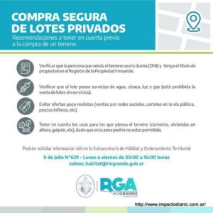 El Municipio de Río Grande recuerda a los vecinos y vecinas una serie de recomendaciones a tener en cuenta previo a la compra de un terreno para evitar posibles fraudes y/o inconvenientes. Se solicita considerar mínimamente los siguientes puntos, previo a realizar cualquier tipo de inversión: