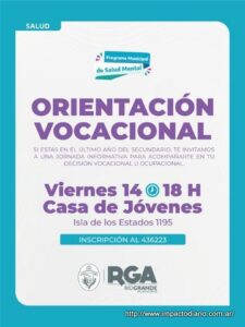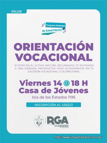 El Municipio de Río Grande, a través de la Dirección de Prevención y Promoción de la Salud Mental —dependiente de la Dirección General de Salud Mental y Adicciones—, recuerda a las y los estudiantes del último año del nivel secundario que el viernes 14 de noviembre, a partir de las 18 horas, se llevará adelante una nueva jornada de orientación vocacional en Casa de Jóvenes (Isla de los Estados 1195).