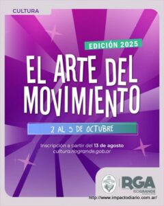 El Municipio de Río Grande, a través de la Agencia de Deportes, Cultura y Turismo, invita a las y los artistas de la ciudad a participar de una nueva edición de “El Arte del Movimiento”, un espacio que fusiona la danza y el trabajo de las distintas academias de baile de la ciudad. Las inscripciones están disponibles en la página web: https://cultura.riogrande.gob.ar/.
