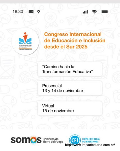 El Ministerio de Educación de la provincia de Tierra del Fuego, AeIAS realizará los días 13, 14 y 15 de noviembre una nueva edición del Congreso Internacional de Educación e Inclusión desde el Sur, el cual ya cuenta con alrededor de 2 mil inscriptos. Se invita a las y los docentes que no lo han hecho a inscribirse hasta el 4 de noviembre a través del código QR que encontrarán en los afiches en cada institución educativa o bien ingresando al siguiente link: