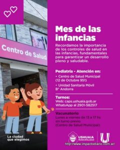 La atención pediátrica se brinda en el Centro de Salud Municipal (12 de Octubre 951) y en la Unidad Sanitaria Móvil del barrio Andorra. Los turnos pueden solicitarse en caps.ushuaia.gob.ar o vía WhatsApp al 2901-582517.