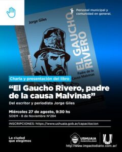 La Municipalidad de Ushuaia invita a los vecinos y vecinas a participar de la presentación del libro «El Gaucho Rivero: Padre de la Causa Malvinas», del periodista, Jorge Giles, la cual tendrá lugar el miércoles 27 de agosto en la sede del SOEM, ubicado en la calle 8 de noviembre 284, a las 9.30 horas.