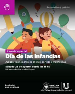La Municipalidad de Ushuaia, a través de la Secretaría de Políticas Sociales, Sanitarias y Derechos Humanos, invita a niñas, niños y familias de la ciudad a participar de una jornada especial por el Mes de las Infancias. La actividad se llevará adelante el sábado 23 de agosto, de 16 a 19 horas, en el Microestadio Cochocho Vargas.