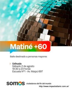 El sábado 2 de agosto la ciudad de Ushuaia será escenario de una nueva edición de Matiné +60, una iniciativa que invita a las personas mayores a compartir una noche de música, baile y alegría. La actividad se desarrollará de 19:30 a 23 horas en la Escuela Provincial N.º 1 (Av. Maipú 697), con entrada libre y gratuita.