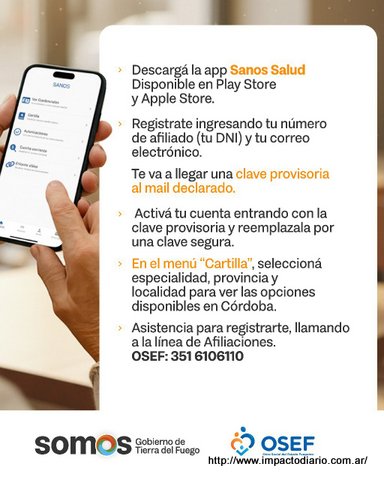 La Obra Social del Estado Fueguino (OSEF) informa que ha establecido un acuerdo con SANOS Salud para brindar cobertura médica a sus afiliados que se encuentren en la provincia de Córdoba. Este convenio tiene como objetivo garantizar el acceso a servicios de salud de calidad, respondiendo a las necesidades de los afiliados en un contexto de complejidad creciente.